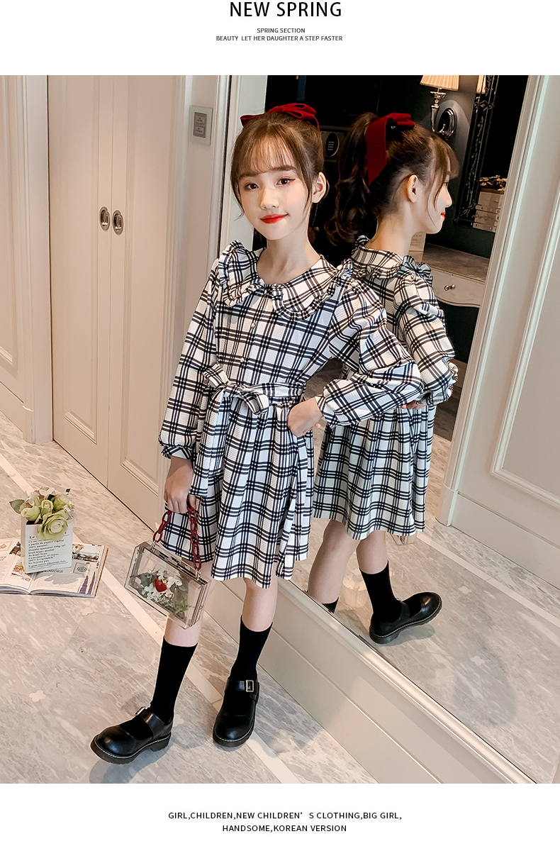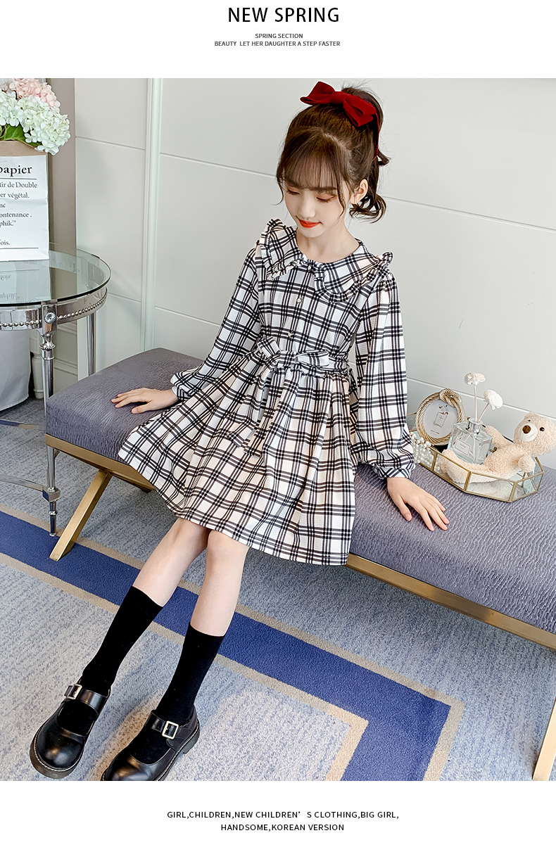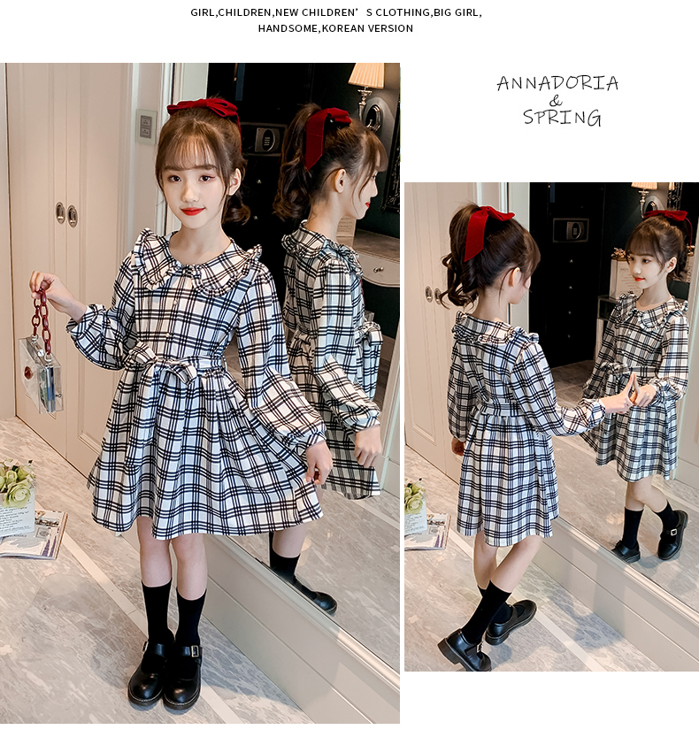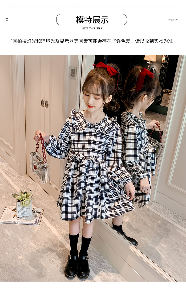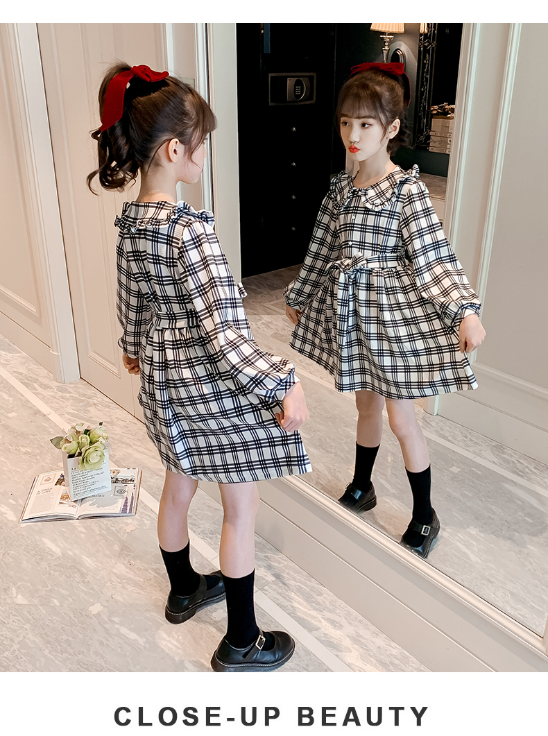 浪莎韓版女童花邊翻領黑白格子連衣裙2021春裝新款兒童長袖公主裙