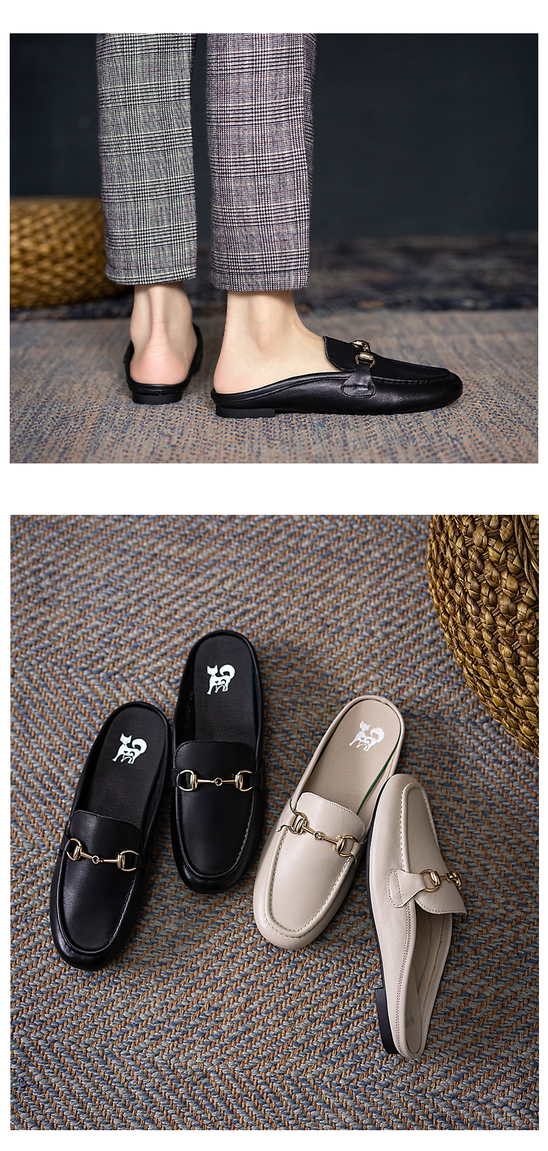 浪莎包頭拖鞋女夏外穿2021春真皮平底半拖鞋粗跟圓頭搭扣穆勒涼拖